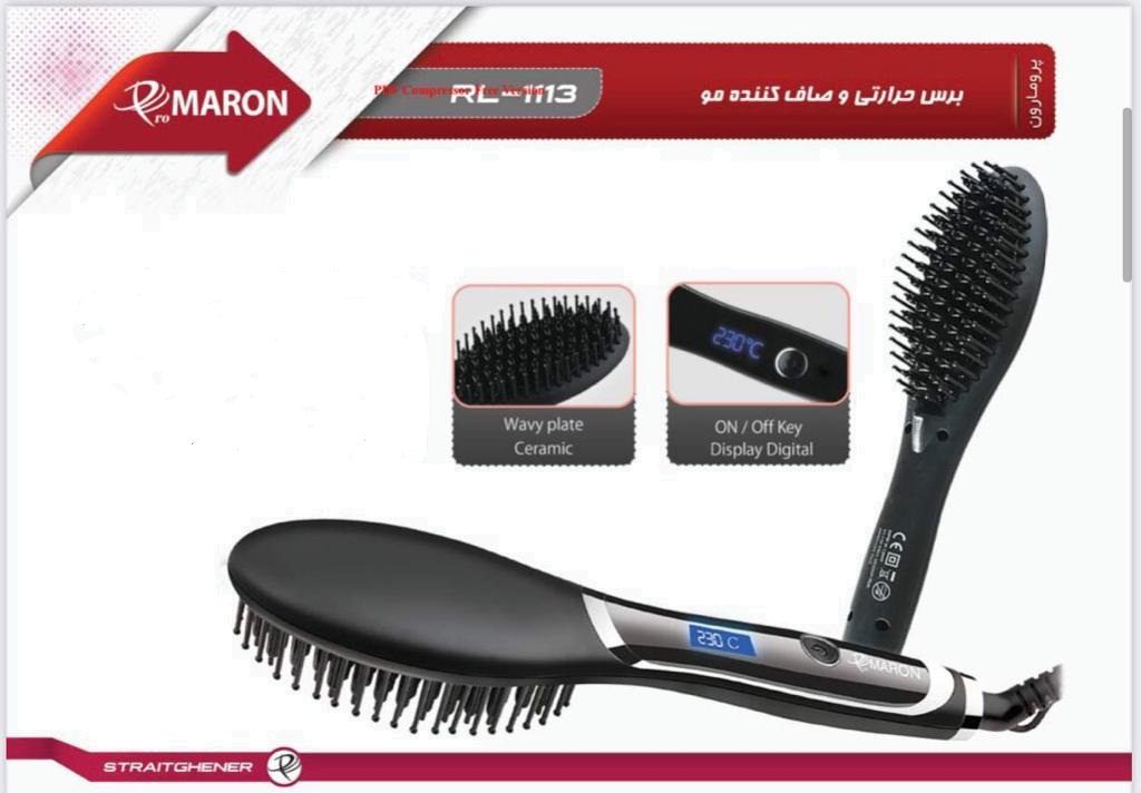برس حرارتی صافکننده مو پرومارون مدل RL-1113، با صفحات متوسط از جنس سرامیک پیشرفته، دارای دکمهی روشن/خاموش، نمایشگر دیجیتال، حرارت قابل تنظیم از 160 الی 230 درجه با توان حرارتی 60 وات و گرمایش سریع، گستره دما 220 تا 240 درجه سانتیگراد