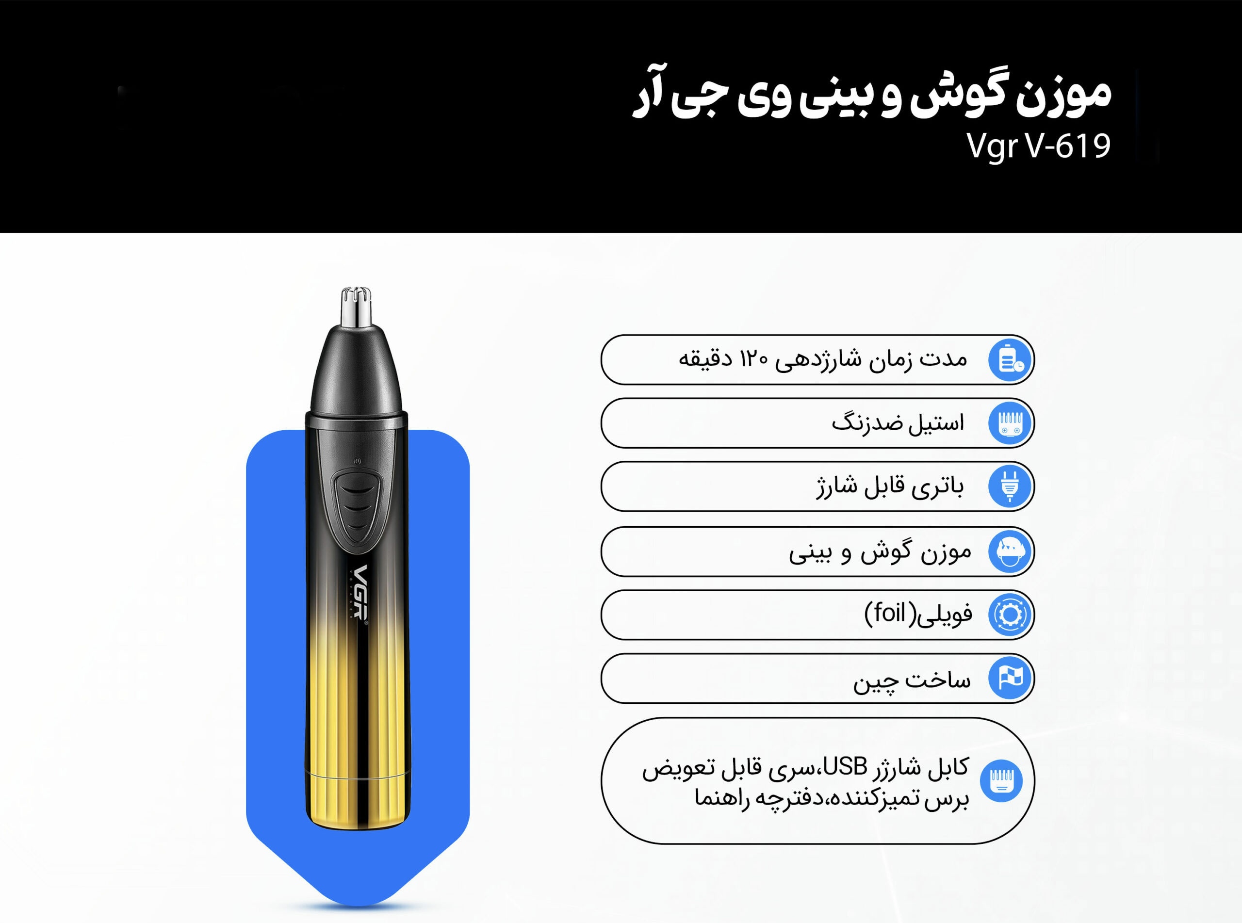 وی جی آر 619 به یک موزن بینی ختم نمیشود، این محصول یک سری شیور چرخشی هم به همراه دارد که در کنار اصلاح موی بینی بتوانید بتوانید صورت خود را هم از موهای زائد پاک کنید. باتری لیتیومی و مخصوصی که در آن استفاده شده آسودگی رو به موقع اصلاح فراهم کرده.