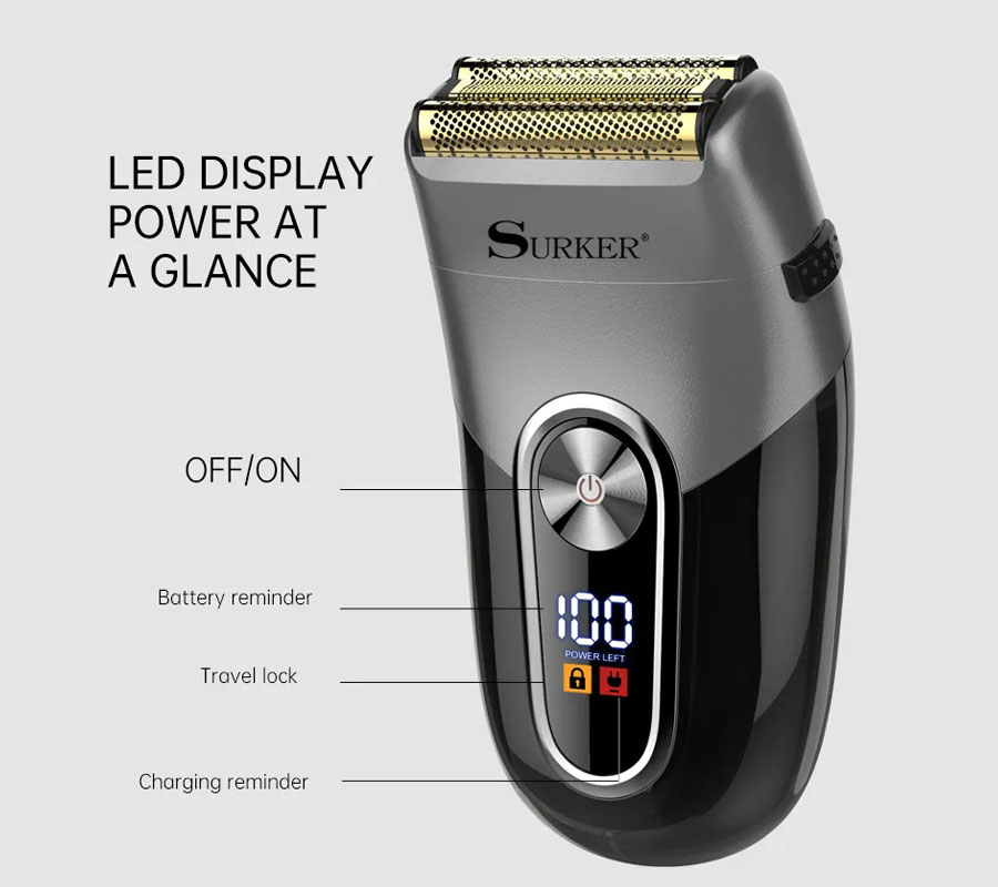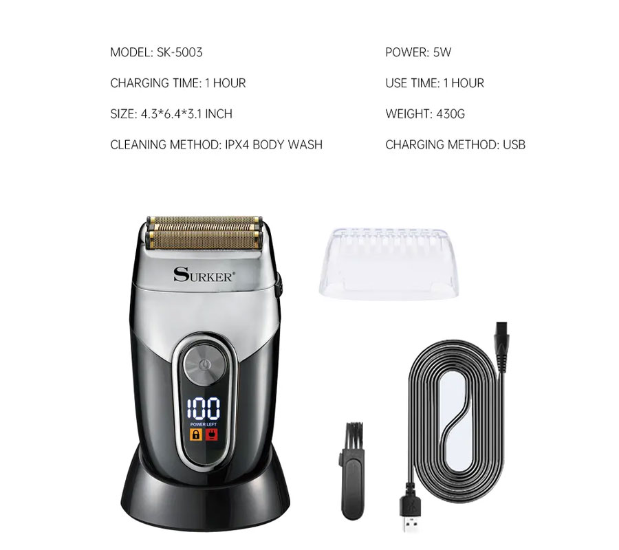 ریش تراش غلتکی SURKER مدل SK-5003 با کیفیت فوق العاده عالی و درجه یک ساخته شده و دارای طراحی منحصر بفرد و بی نظیر می باشد. از تکنولوژی برش غلطکی بهره می گیرد و صورت را به صورت صفر همانند ژیلت اصلاح می کند. تیغه های دستگاه از استیل مقاوم و پیشرفته ساخته شده است. تیغه های دستگاه از کیفیت بی نظیری برخوردارند. این تیغه ها به صورت توری و با قابلیت باز شدن و شستشو طراحی شده اند. به منظور اصلاح بهتر و سریعتر دو توری برای آن در نظر گرفته شده است.این دستگاه ضد آب است و می توان به عنوان زیر دوشی از آن استفاده نمود. همچنین با کف اصلاح هم قابل استفاده است. ریش تراش SURKER دیجیتالی است و دارای صفحه نمایش جهت نشان دادن شارژ آن می باشد. بر روی بدنه دستگاه کلید خاموش/روشن و قفل آن نیز طراحی شده است. منبع تغذیه آن باتری قابل شارژ و برق مستقیم می باشد. شرکت SURKER در ساخت این ماشین از یک باتری قابل شارژ بسیار با کیفیت استفاده کرده است. که در 1 ساعت به صورت کامل شارژ می شود و حداقل 60 دقیقه می توانید به صورت مداوم از دستگاه استفاده کنید. ترکیب رنگ مشکی و طلایی و طراحی ارگونومیک باعث شده است که این دستگاه به یکی از شیک ترین ریش تراش های موجود در بازار تبدیل شود. در ساخت این ریش تراش از پلاستیک فشرده استفاده شده است. که استحکام باور نکردنی به آن داده است. موتور دستگاه بسیار پرقدرت و در عین حال کم صدا می باشد. همچنین دارای یک جعبه بسیار شیک و کادویی می باشد و بهترین گزینه برای هدیه دادن است.